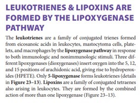 Leukotrienes are derived from arachidonic acid through the lipoxygenase pathway. Reference: Rodwell, V., Bender, D., Botham, K., Kennelly, P., & Weil, A. P. (2015b). Harper’s Illustrated Biochemistry (30th ed., p. 240). McGraw-Hill Education / Medical.
