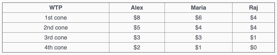 We can determine the total market demand at $3 by adding together the total number of cones at which Alex, Maria, and Raj’s WTP is $3 or higher. We can see that Alex will buy 3 cones at $3 or higher, Maria will also buy 3, and Raj will buy 2, which adds up to a total of 8 cones demanded at $3. Repeating the same process for $4 (or higher), we get 2 cones for Alex, 2 cones for Maria, and 2 cones for Raj, which adds up to a total of 6 cones demanded at $4. Once we have these quantities for demand at the new and old prices, we can plug them into the equation for price elasticity of demand = absolute value of [(6-8)/8]/[(4-3)/3] = 3/4.