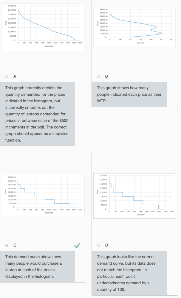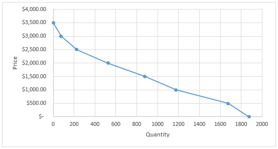 Below is the demand curve for laptops for another set of incoming undergraduates. Note that this demand curve depicts how many students would be willing to purchase a laptop at any given price, not just price increments of $500.