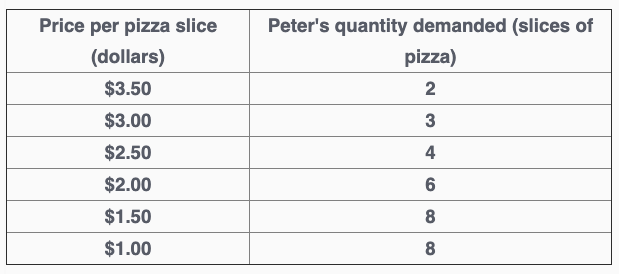 This does not necessarily follow from the table. Peter might be willing to order more than 8 slices if the price fell low enough. (Whether Peter should consume more than a whole pizza is another story).
