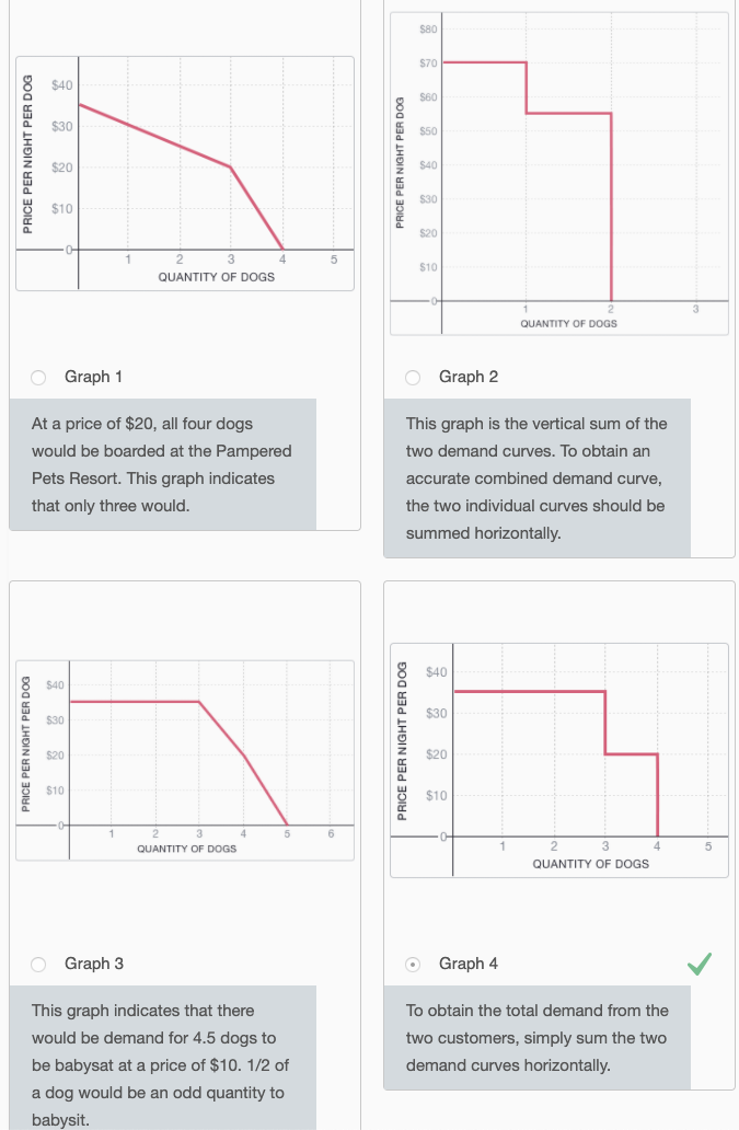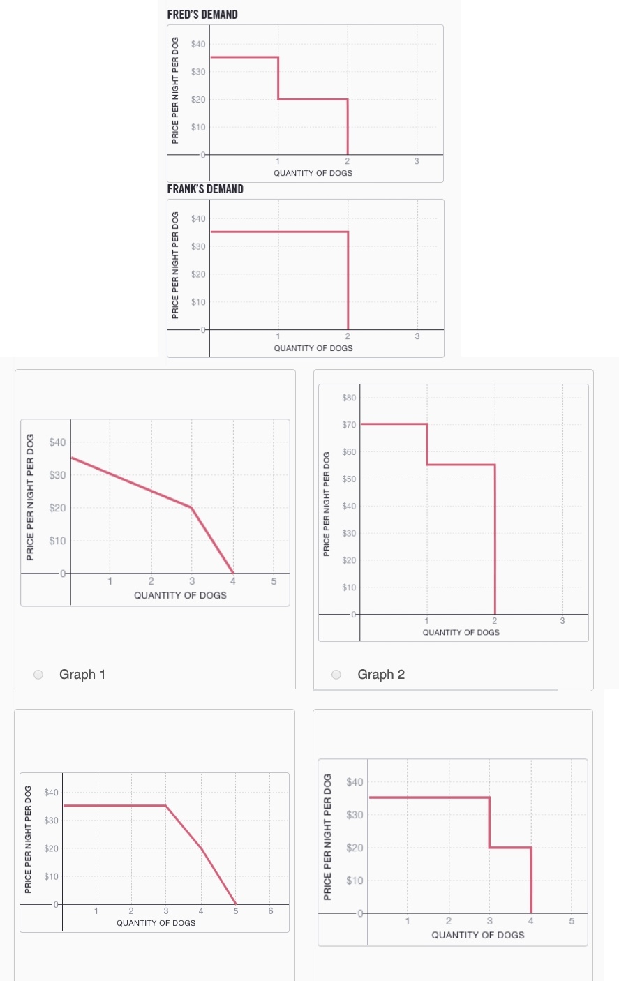 Fred and Frank are vacationing dog owners. Each owns two dogs which he would like to leave behind at the Pampered Pets Resort while he travels. The graphs below depict their individual demand curves for dog babysitting services.