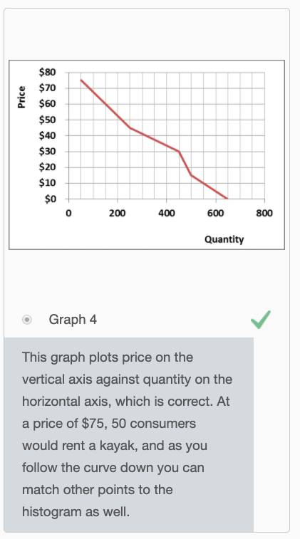 This graph plots price on the vertical axis against quantity on the horizontal axis, which is correct. At a price of $75, 50 consumers would rent a kayak, and as you follow the curve down you can match other points to the histogram as well.