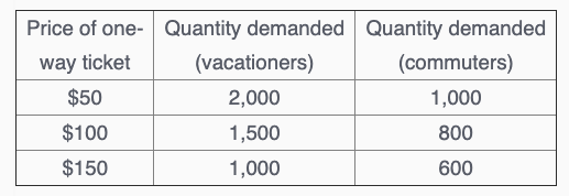 The vacationers have a price elasticity of demand equal to 0.25, compared to 0.2 for commuters. This more elastic demand could be due to vacationers’ more flexible travel schedules—the flexibility to travel at different times essentially gives the vacationers more substitutes.