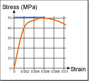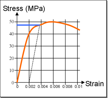 Proof stress is used when the elastic limit is gradual and hard to locate. It is the stress at a defined plastic strain, often 0.2%. A line is drawn parallel to the curve, depicting the elastic region, to a point on the strain axis. The proof stress is where this line interacts the curve (here 0.2% = 48MPa)