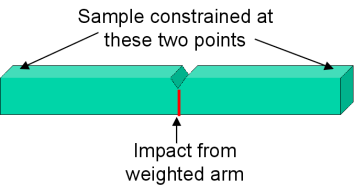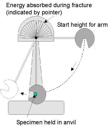 The charpy impact speciums are produced as a bar containing a notch. The height the pendulum swings to after the failure is a direct measure of the amount of energy absorbed during fracture.
