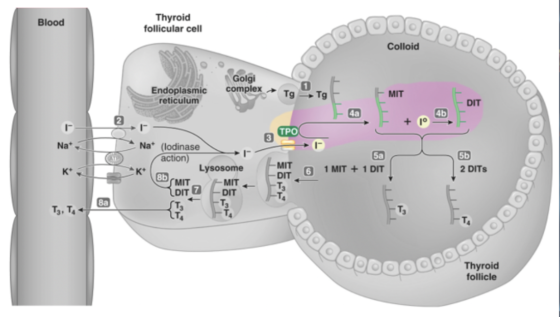 tyrosine-containing thyroglobulin is produced within the follicular cells by the endoplasmic reticulum-Golgi complex and is transported to the colloid by exocytosis
