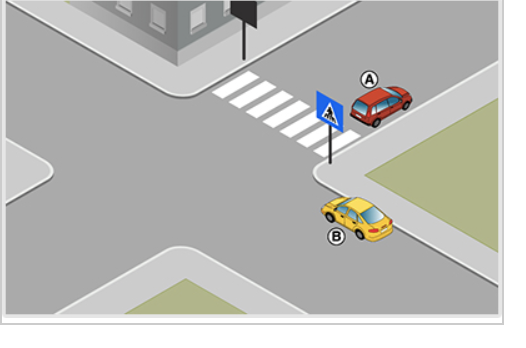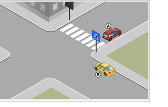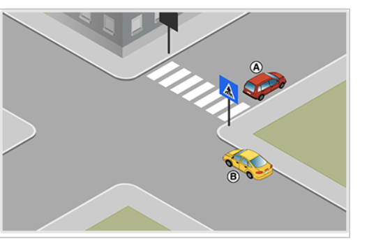 The stationary cars “A” and “B” shown in the illustration are waiting at a distance of 5 metres from the intersecting points of the edges of the carriageways. Which of them is waiting according to the rules?