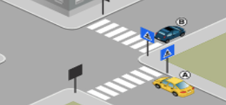 The cars “A” and “B” are waiting at a distance of 5 metres from the intersecting points of the edges of the carriageways. Which of them is waiting adhering to the rules?
