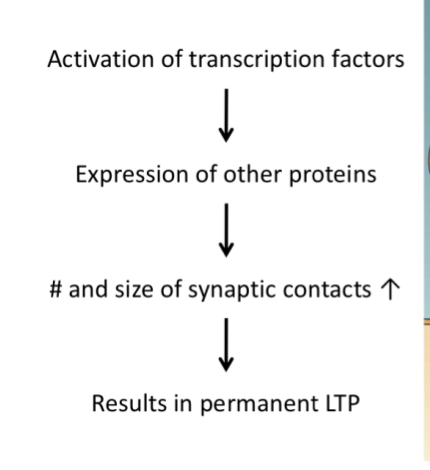 The secondary change that occurs with LTP = Areas with a lot of calcium will remodel the cytoskeleton and overtime if the synapse is strong, what starts to happen is you will start to experience more “buding” = more pronounced surface area and more pronounced connection of the post-synaptic side to where it will receive neurotransmitters from the pre-synaptic terminal = more binding sites and this physical change in the dendrites.