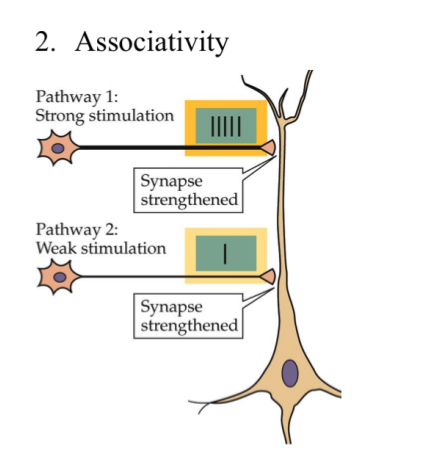 Associativity = If a weak stimulation of a neural pathway is accompanied by strong stimulation in a pathway that is close, both synapses will have LTP.
