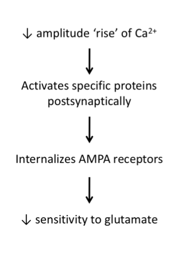 With an increase in intracellular calcium this results in several biochemical events = consequence is LTP = Increase in the number, size and length of dendrites spines (glutamatergic) + increase in the number of binding sites for glutamate.
