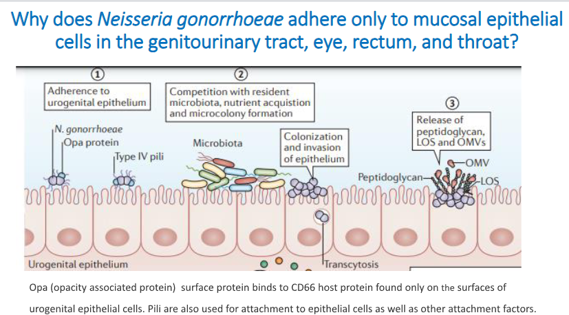 Why does Neisseria gonorrhoeae adhere only to mucosal epithelial cells in the genitourinary tract, eye, rectum and throat