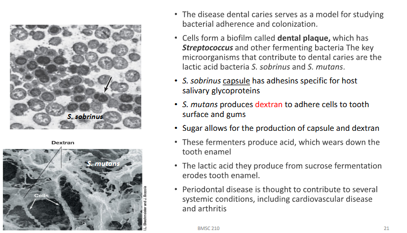 Explain bacterial adherence and colonization of dental caries