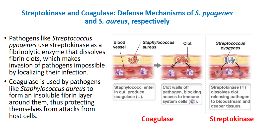 Explain streptokinase and coagulase as defense mechanisms of S. pyogenes and S. aureus