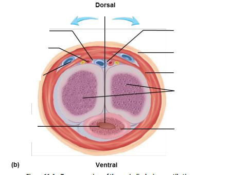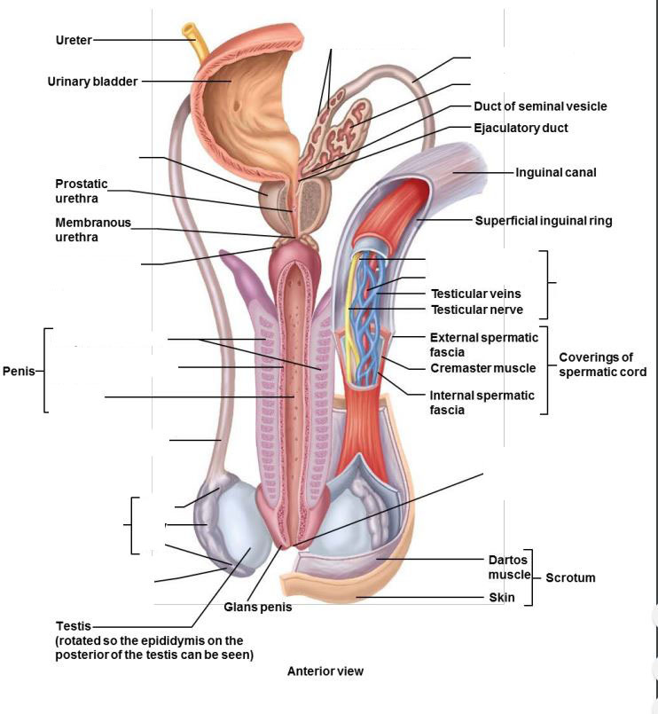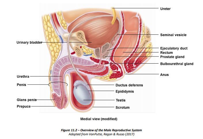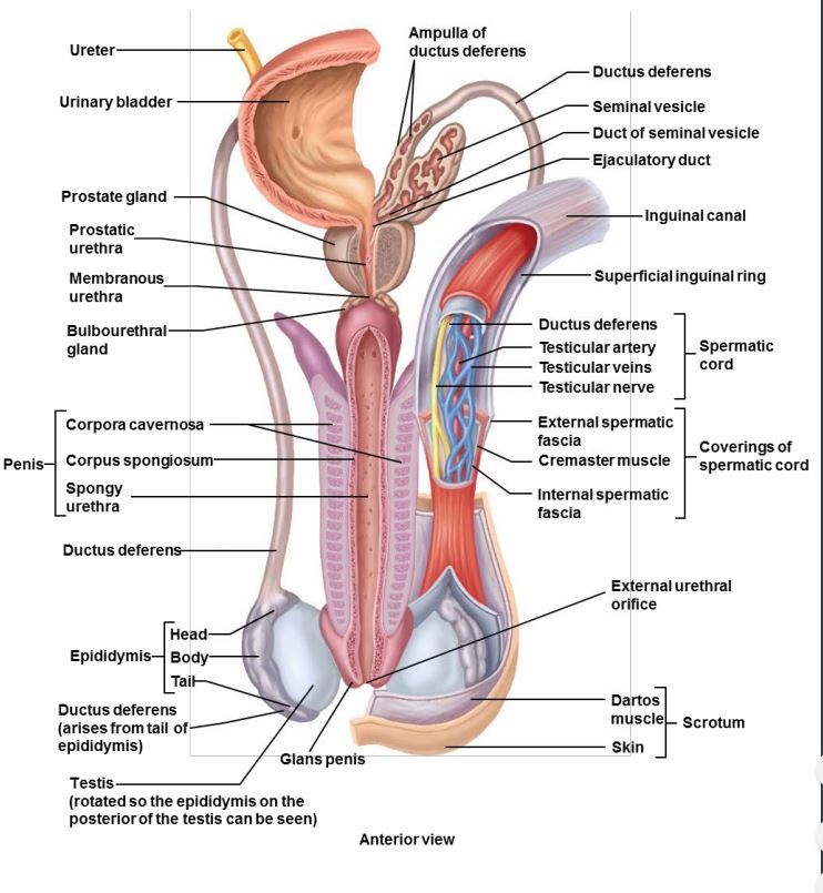 Glans penis, prepuce (foreskin), body of penis, corpus spongiosum, testis, corpus cavernosum