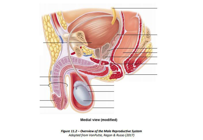 Epididymis, prostatic urethra, vas deferens, ejaculatory duct, spongy urethra, membranous urethra