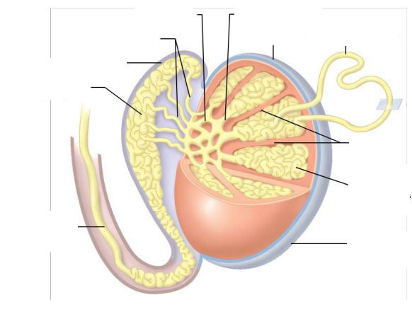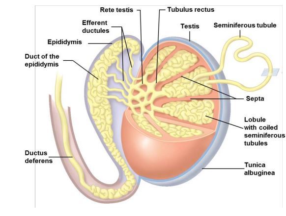 1) Seminiferous tubules 2) Straight tubules (rectus) 3) Rete tesits 4) Efferent ductules 5) Head of epididymis 6) body of epididymis 7) talk of epididymis 8) vas deferens