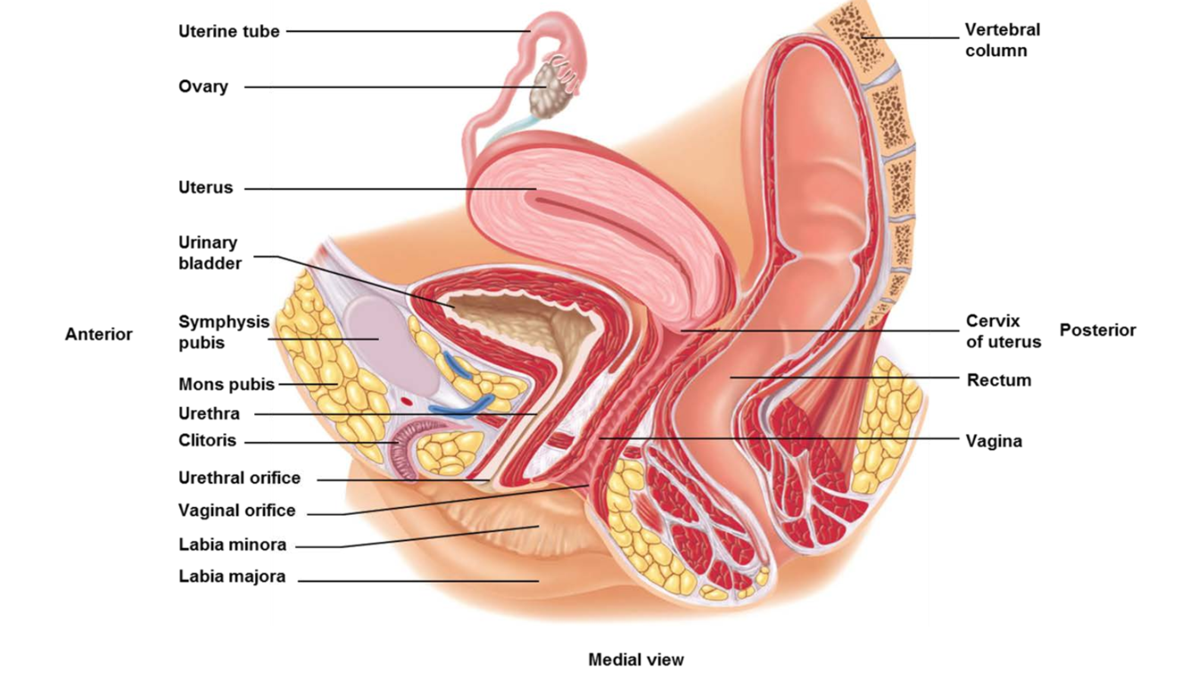 Ovary, uterine tube (oviduct), uterus, cervix, vagina, urethra, fimbriae