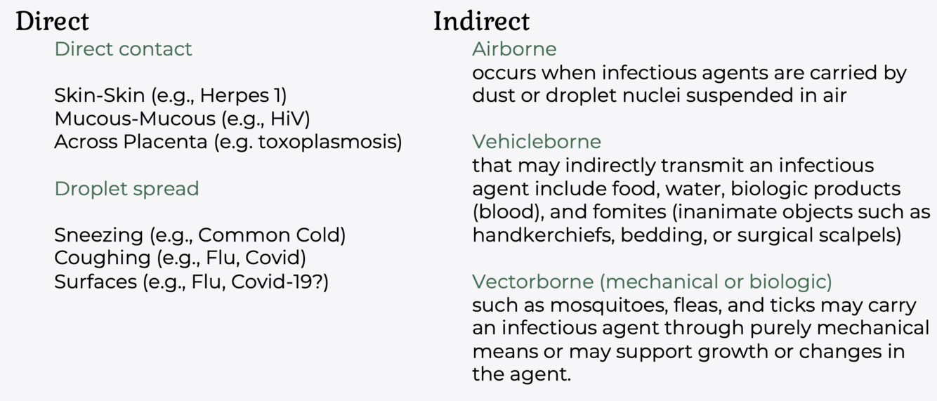 What are some the three forms of direct transmission and the three forms of indirect transmission?