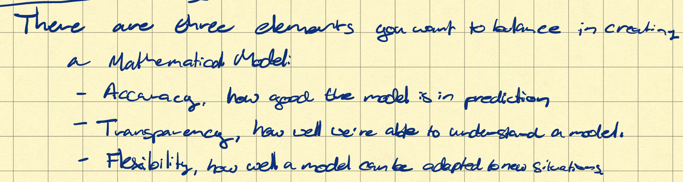 What are the three elements you’d like to balance in creating a mathematical model?