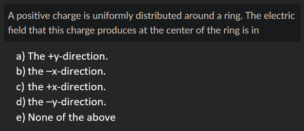 The electric field at the center of a ring of uniform positive charge is zero.