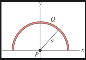 Positive charge is uniformly distributed around a semicircle. The electric field that this charge produces at the center of curvature P is in what direction?