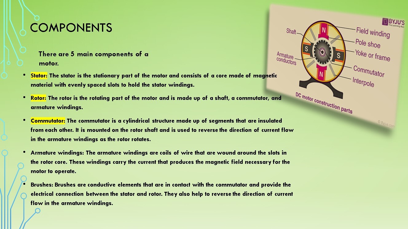 A DC (directcurrent) motor is an electrical machine that converts electrical energy into mechanical energy. It works on the principle of electromagnetism, wherea magnetic field is used by passing an electric current through a wire coil. This magnetic field interacts with a permanent magnet, creating a rotational force that drives the motor.
