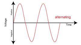 AC gets its name from the way that the direction of electron flow changes or alternates. In this process the positive and negative charges at either end of the conductor switch positions which results in the reversal of electron direction.