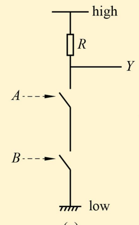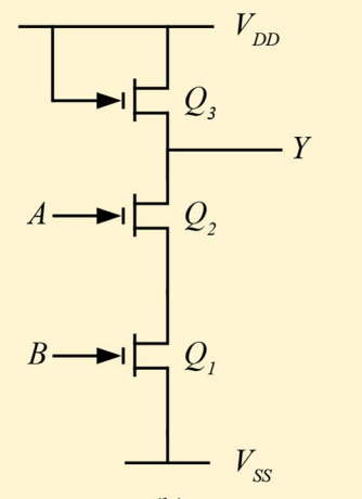 Whilst inputs ‘A’ and ‘B’ are high, there is a reverse-biaed NP junction between the emitter and base. This draws a small reverse-biaed current, whih goes through the collected in to the second transistor. This allows VT2 to conductor (collector - emitter), driving the output ‘Q’ to low.