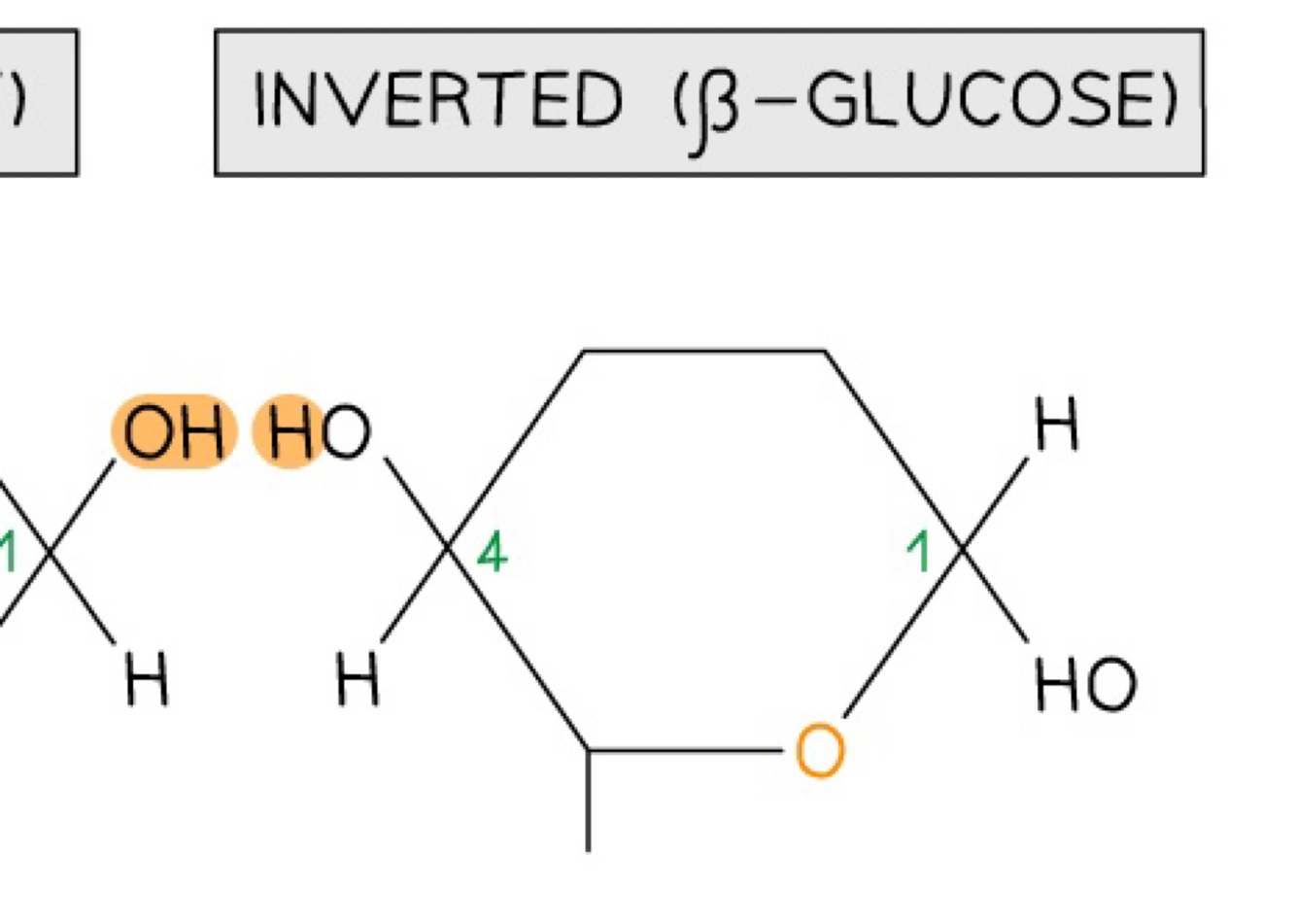 When beta glucose molecules bond, they form straight cellulose chains with every other beta glucose molecule inverting 180° so the monosaccharides can bond