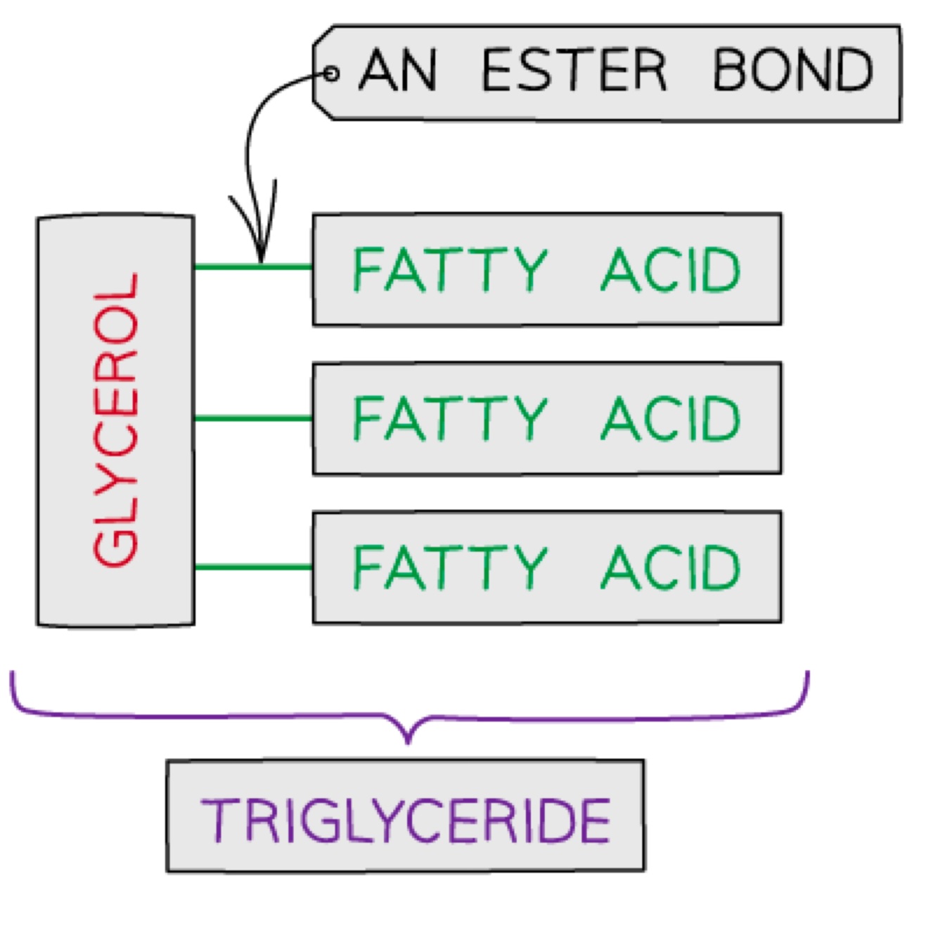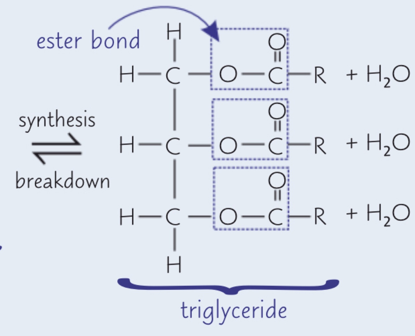 Triglycerides are synthesised by the formation of an ester bond between each fatty acid and the glycerol molecule