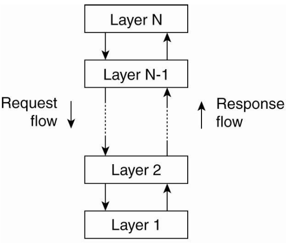 Control flows from layer to layer: Requests flow down the hierarchy and responses flow up the hierarchy.