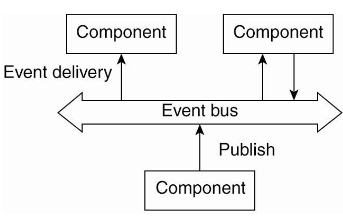 Components communicate by propagating events. Publish/Subscribe systems are used for communicating asynchronous events