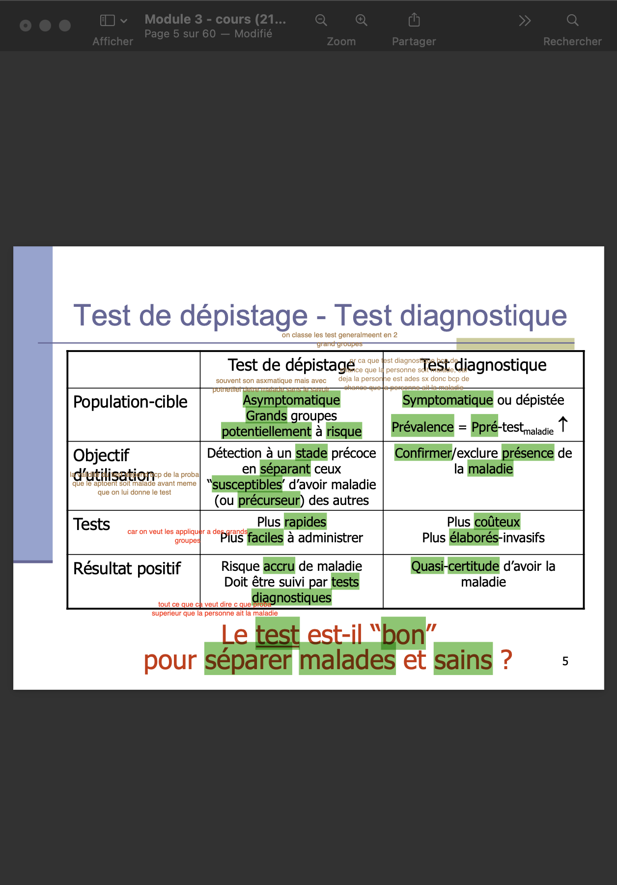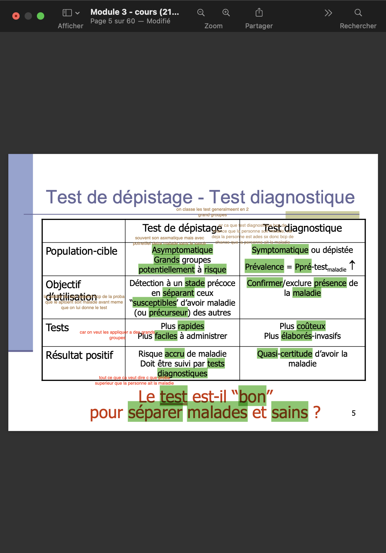 Explique la différence entre le test de dépistage et le test diagnostique en ce qui a trait à Présence résultat positif?
