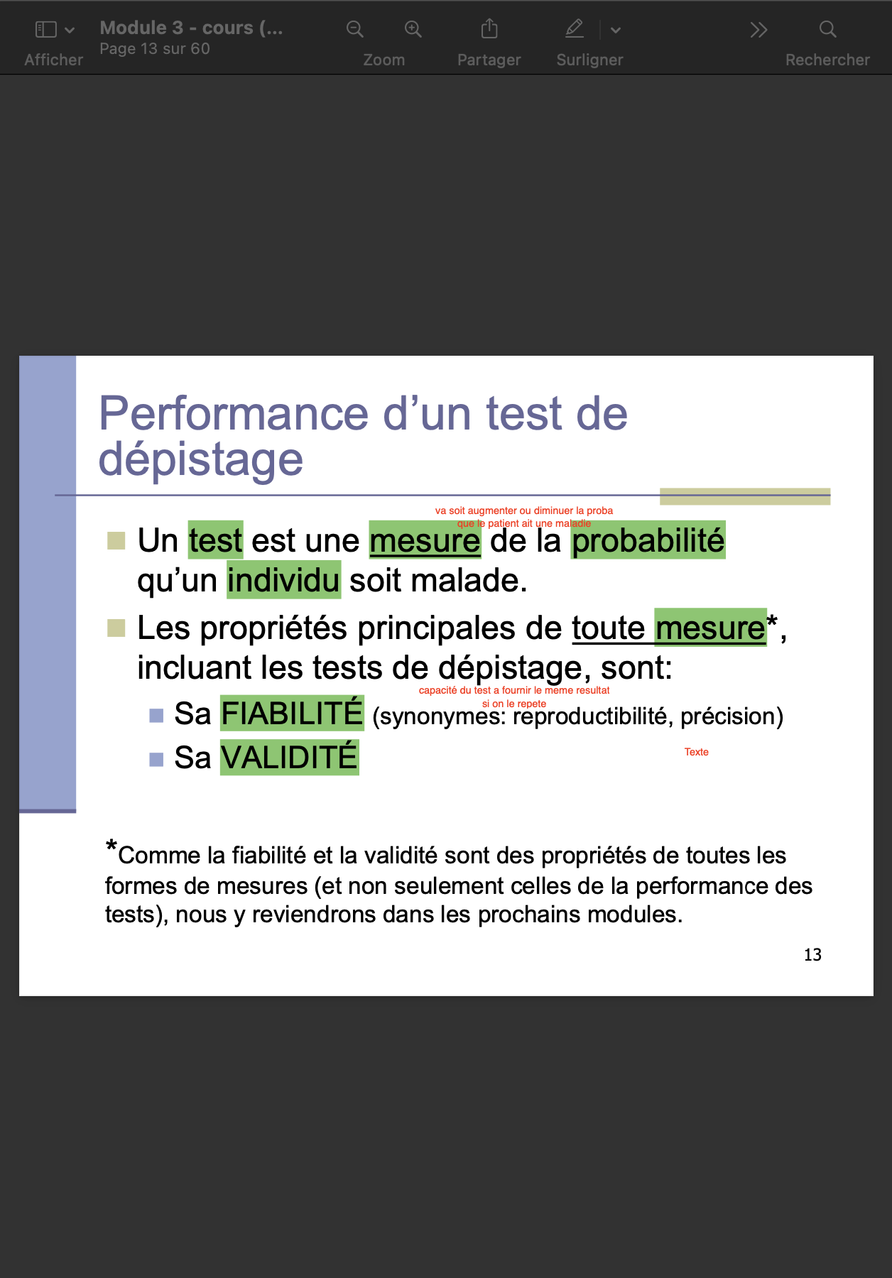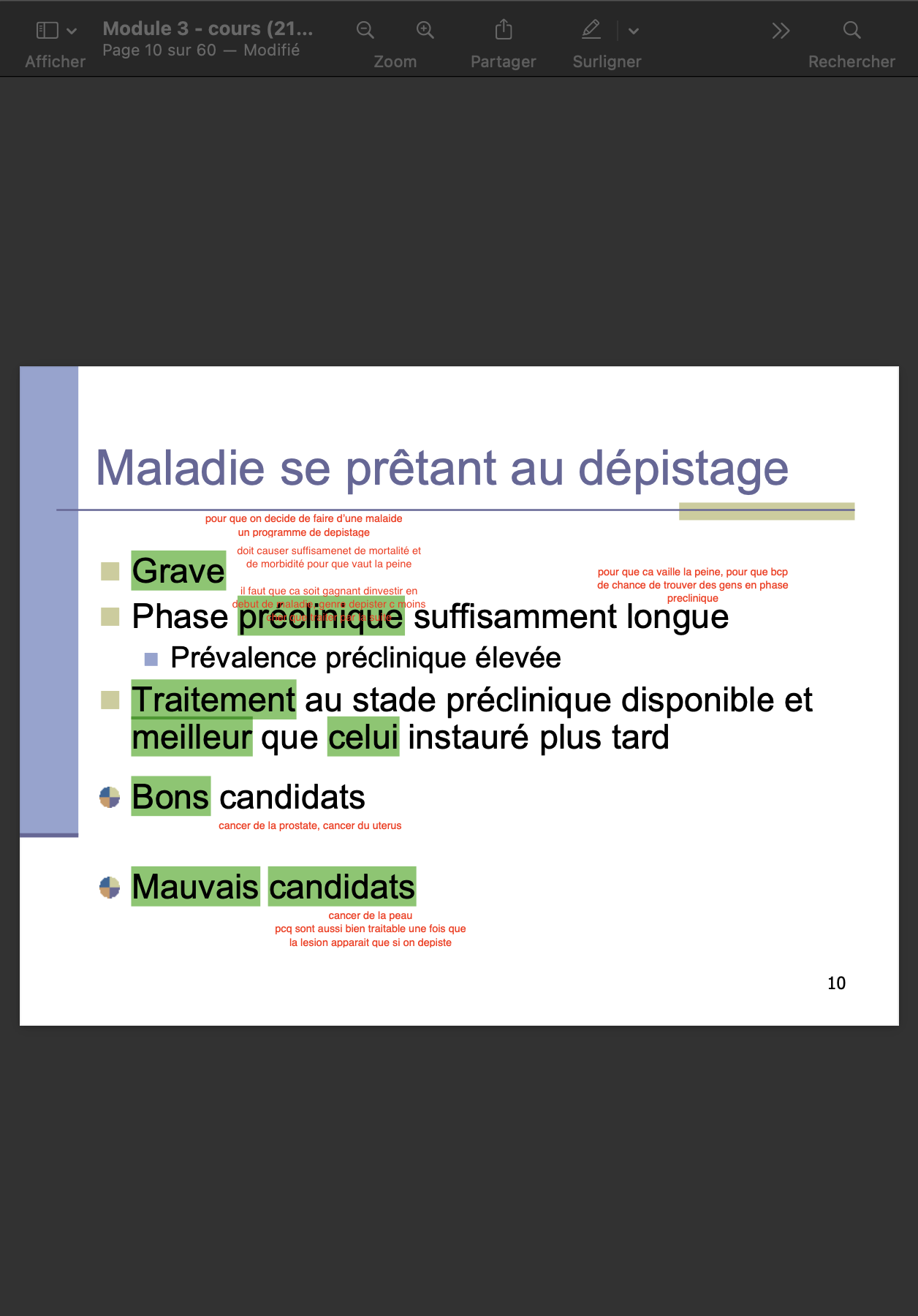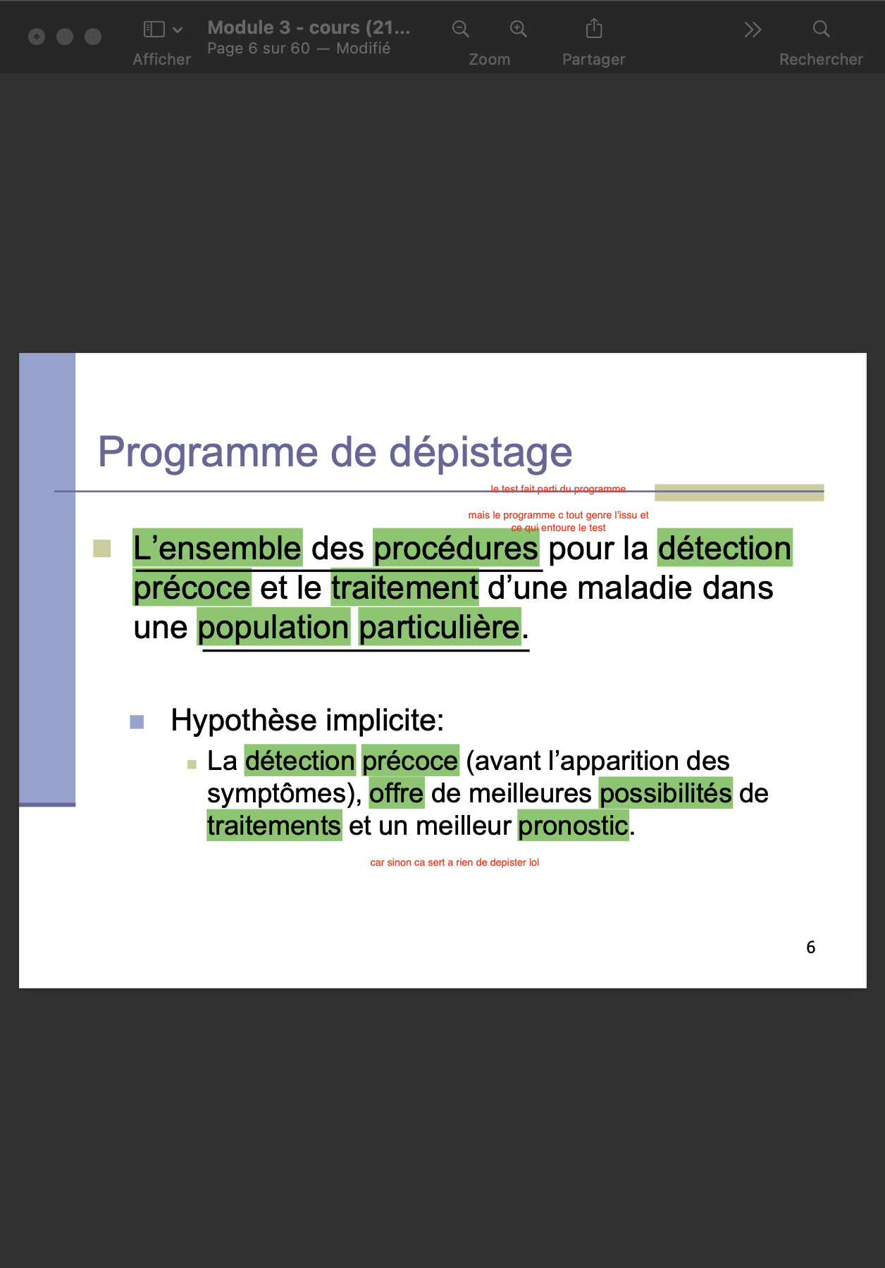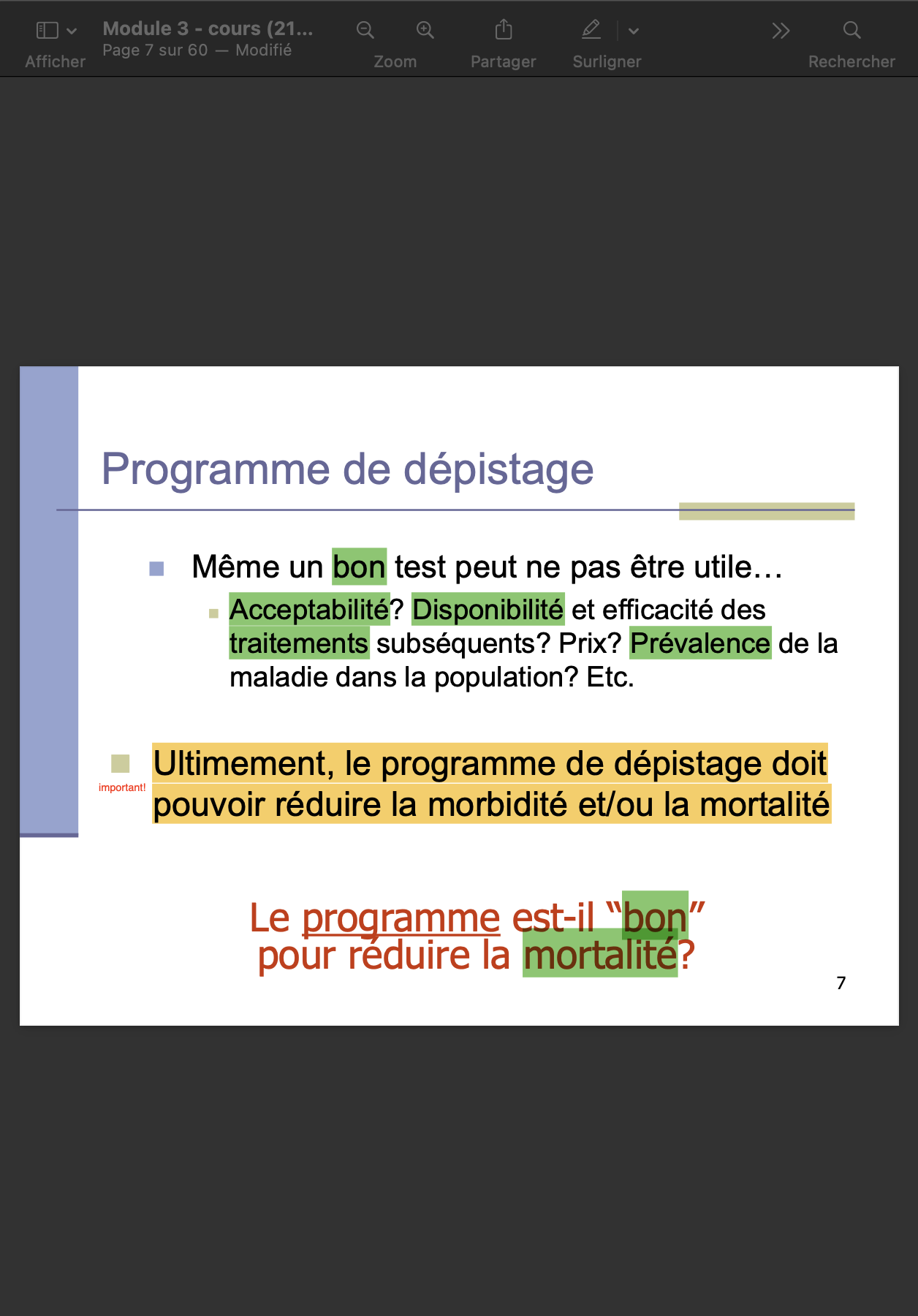 Il faut que la détecction précoce de la maladie donne de meilleur possibilité de tx et une pronostic que si on fait ça plus tard