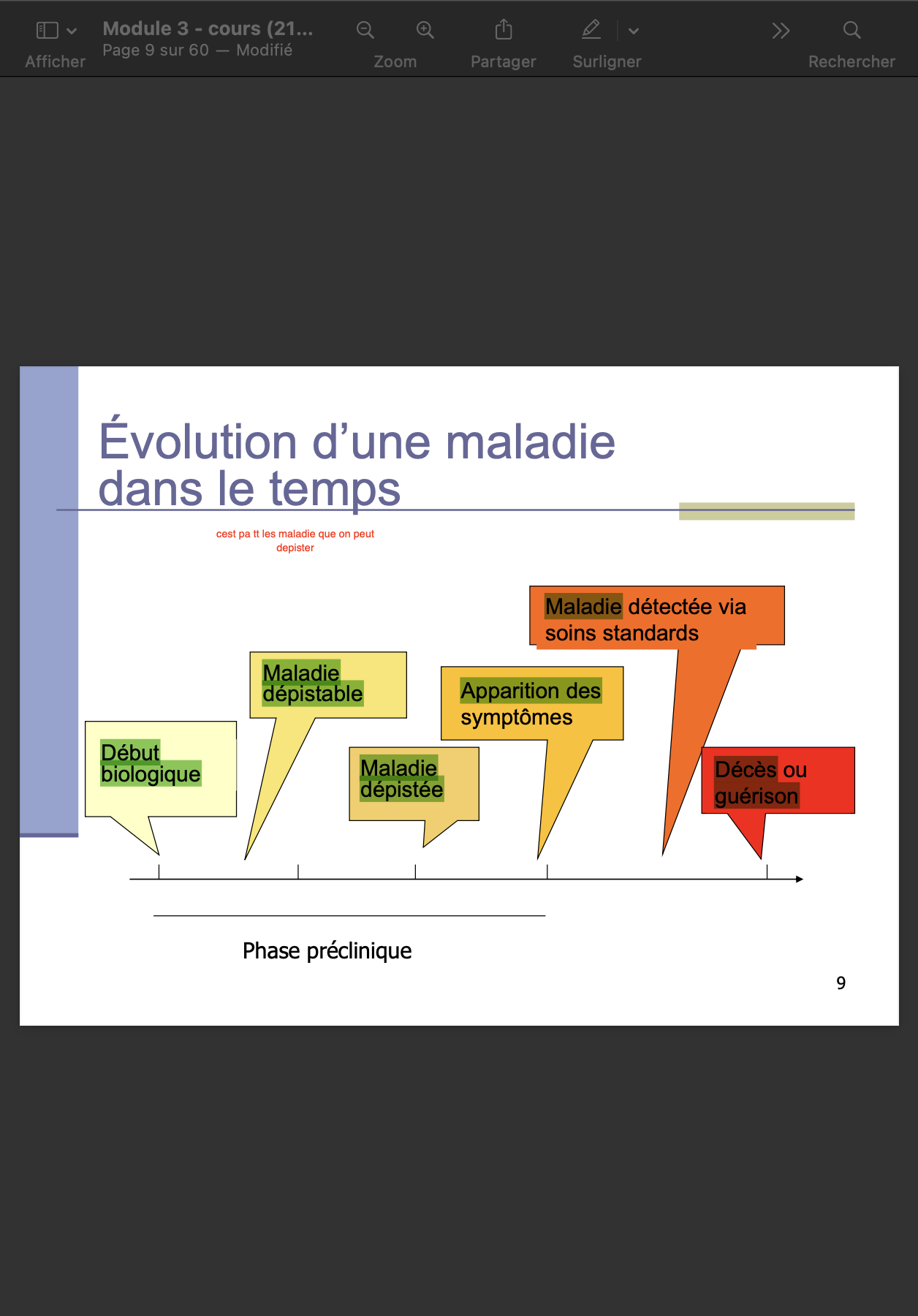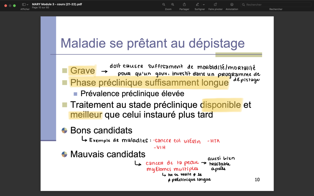 Phase préclinique suffisament longue, avec prévalence préclinique élevée (pour que grande chance de trouver la maladie)