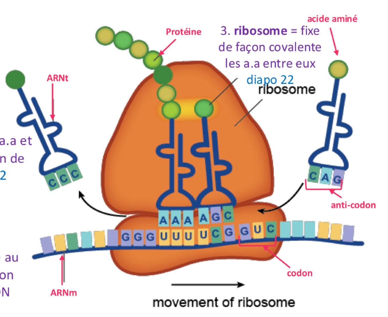 Anti-codon: séquence complémentaire sur l’ARNt permettant la reconnaissance du bon acide aminé