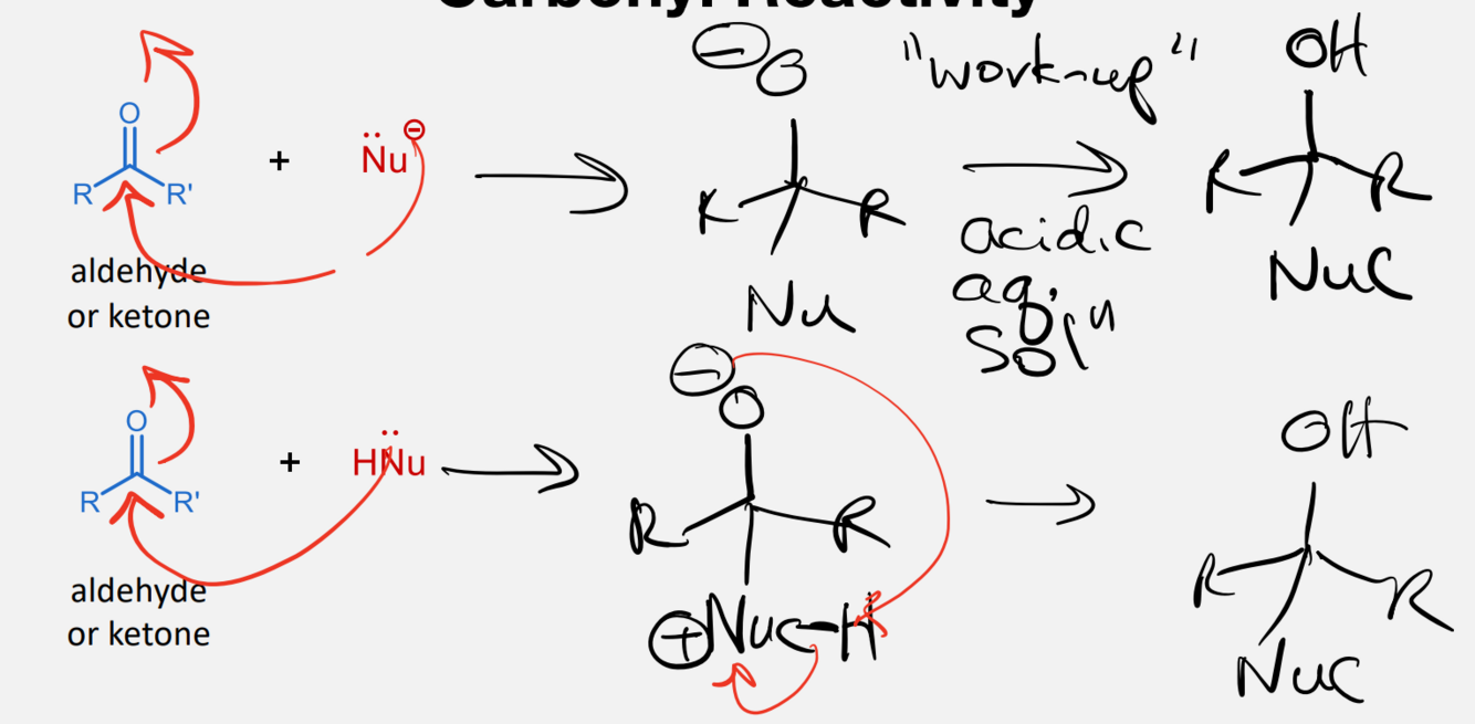 What are the two possible nucleophilic additions onto carbonyls? Draw the two