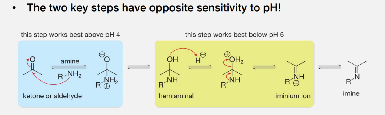 Show how a imine formation would work differently in acidic (slightly), and basic conditions