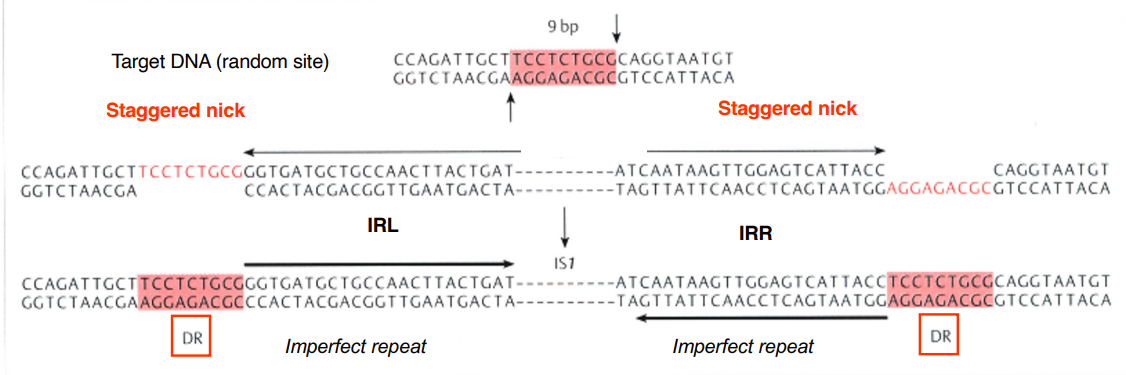 Transposase cuts target DNA (staggered nick), IS integrates, and gaps are filled by DNA polymerase and DNA ligase. Formation of direct repeats (DR) flanking the integrated IS.