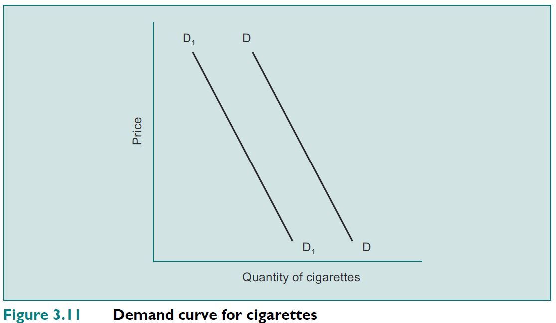 In Figure 3.11 the demand curve for cigarettes could have shifted from DD to D1D1 (assuming cigarettes not to be an inferior good) because of
