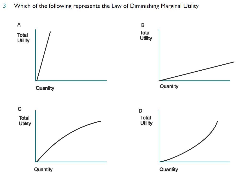 The correct answer is C. As an individual consumes more of a good total utility increases but at a decreasing rate, i.e. each additional unit consumed contributes less utility than the previous unit. In figures A and B the lines are straight; this would indicate constant marginal utility (MU). Thus A and B are wrong. In figure D, the slope of the line (change in total utility/change in quantity) i.e. UQ increases as Q increases indicating increasing marginal utility as Q increases. Thus D is wrong. In figure C the opposite occurs; MU decreases as Q increases.