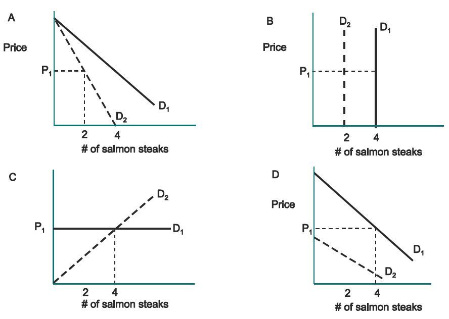 The correct answer is D. Diagram B shows 2 completely price inelastic demand curves so B is wrong. Diagram C shows a positively inclined demand curve D2 so C is wrong. Diagram A indicates 2 salmon steaks are purchased so A is wrong. Diagram D indicates no steaks purchased when the demand curve shifts to the left which it does because of the fall in the price of tuna.