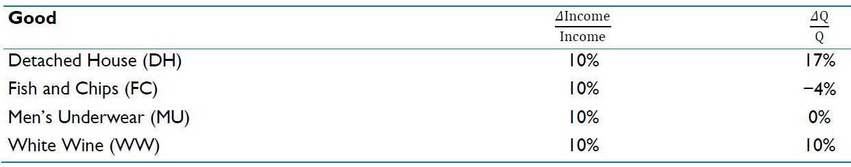 The correct answer is C. For DH, the quantity demanded increases by a greater proportion (17%) than the increase in income (10%), therefore income elasticity of DH is > 1; for FC it is negative −4%/10%, for MU it is zero 0%/10% and for WW = 1, 10%/10%.