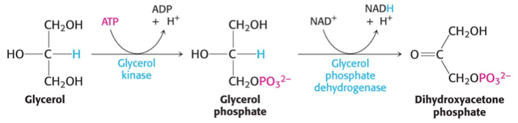 There, glycerol is converted to dihydroxyacetone phosphate in a two-step process