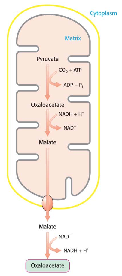 Once in the cytosol, malate is converted back to oxaloacetate by the same enzyme