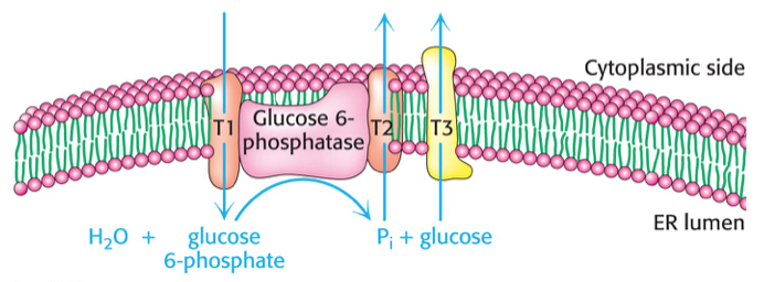 The enzyme glucose 6-phosphatase resides in the lumen (i.e., inside) of the endoplasmic reticulum, thus requiring that the glucose 6-P produced in the cytosol be shuttled into the ER.