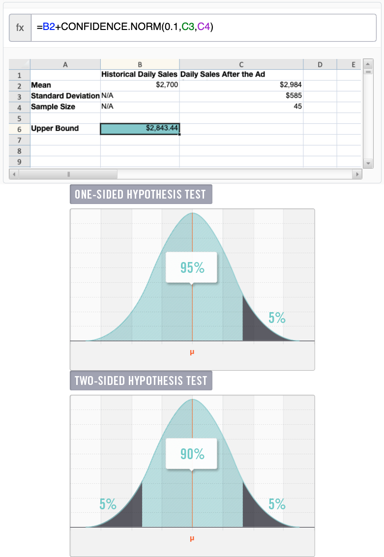 To construct a 95% range of likely sample means, calculate the margin of error using the function CONFIDENCE.NORM(alpha, standard_dev, size). However, CONFIDENCE.NORM finds the margin of error for a two-sided hypothesis test and this question asks for the upper bound of a one-sided test. To find the upper bound for the one-sided test you must first determine what two-sided test would have a 5% rejection region on the right side. Since the distribution of sample means is symmetric, a two-sided test with a 10% significance level would have a 5% rejection region on the left side of the normal distribution and a 5% rejection region on the right side. Thus, the upper bound for a two-sided test with alpha=0.1 will be the same as the upper bound on a one-sided test with alpha=0.05. The margin of error is CONFIDENCE.NORM(alpha, standard_dev, size)= CONFIDENCE.NORM(0.1,C3,C4)=CONFIDENCE.NORM(0.1,585,45)=$143.44. The upper bound of the 95% range of likely sample means for this one-sided hypothesis test is the population mean plus the margin of error, which is approximately $2,700+$143.44=$2,843.44.