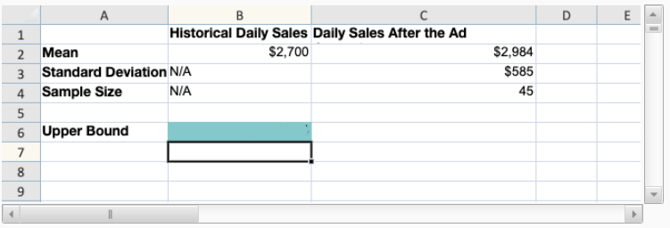 The owner of a local health food store recently started a new ad campaign to attract more business and wants to test whether average daily sales have increased. Historically average daily sales were approximately $2,700. After the ad campaign, the owner took another random sample of forty-five days and found that average daily sales were $2,984 with a standard deviation of approximately $585. Calculate the upper bound of the 95% range of likely sample means for this one-sided hypothesis test using the CONFIDENCE.NORM function.