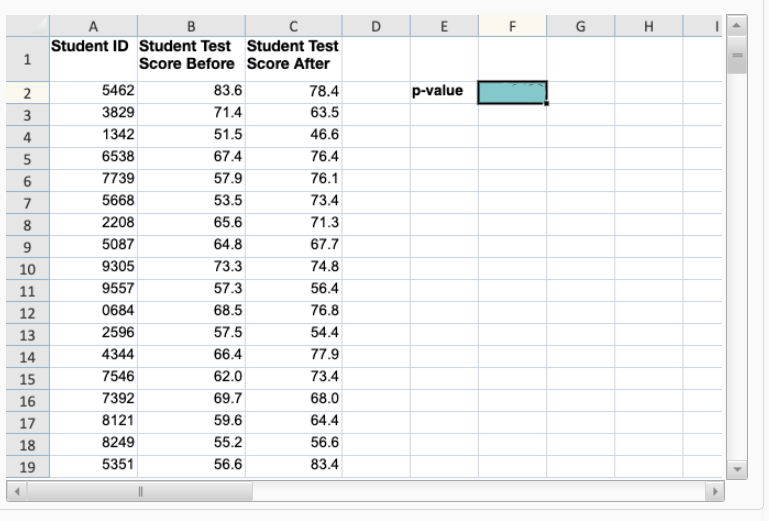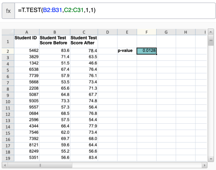 The p-value of the one-sided hypothesis test is T.TEST(array1, array2, tails, type)=T.TEST(B2:B31,C2:C31,1,1), which is approximately 0.0128. You must designate this test as a one-sided test (that is, assign the value 1 to the tails argument) and as a type 1 (a paired test) because you are testing the same students on the same knowledge at two points in time. You must link directly to values in order to obtain the correct answer.